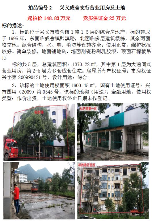 二、興義威舍支行營業用房及土地,建筑面積1370.22㎡;