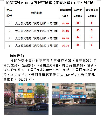 5、大方縣交通路(慶北春路)4間門面(建筑面積分別為:28.09㎡、31.09㎡、39.59㎡、24.38㎡);