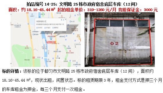 13、文明路25棟市政府宿舍底層車庫(12間)3年租賃權(面積約18.16㎡-45.44㎡)。