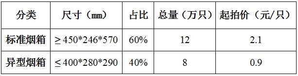 標的物為非循環利用紙箱,年產數量為20余萬只,由標準煙箱(占比約60%)和異型煙箱(占比約40%)組成,使用正常。參加拍賣會的意向競買人須具備紙制品再生能源、廢舊物資回收等相關資質。