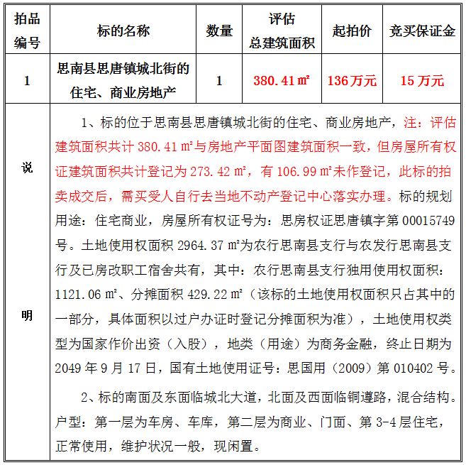 1、思南縣思唐鎮(zhèn)城北街的住宅、商業(yè)房地產(chǎn),建筑面積共:380.41㎡;起拍價(jià):136萬元;競(jìng)買保證金15萬元。