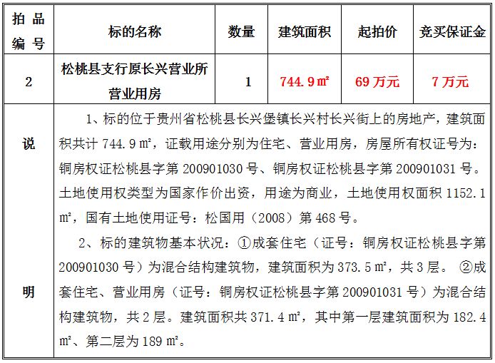 2、松桃縣支行原長興營業(yè)所營業(yè)用房,建筑面積共:744.9㎡;起拍價(jià):69萬元;競(jìng)買保證金:7萬元