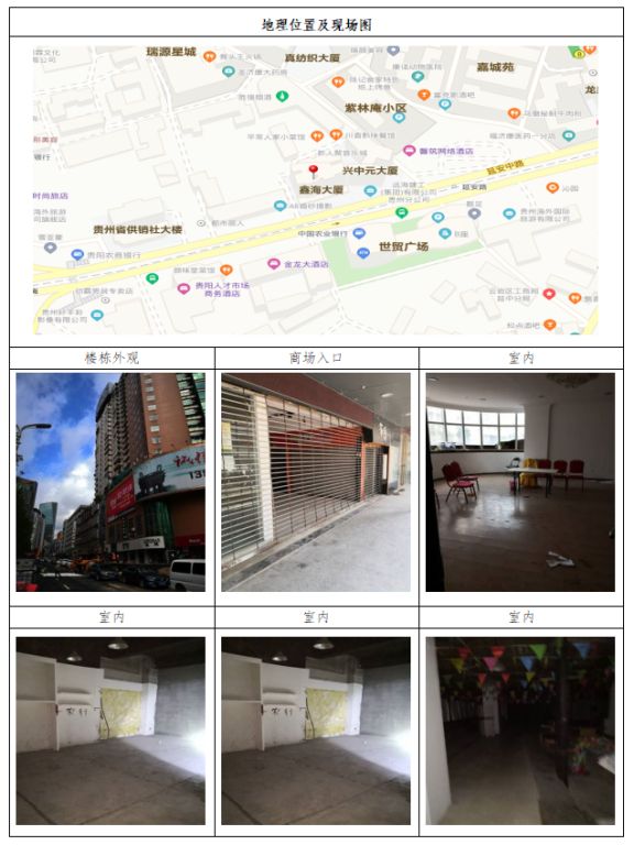 該標的南面臨延安西路,其余三面臨其他樓棟,區域內有噴水池商圈(國貿廣場購物中心、南國花錦購物中心、龍港百盛購物中心)、匯金星力城購物中心,商業聚集度高,距離貴陽地鐵1號線噴水池站約300米,距離噴水池商圈約500米,距離匯金星力城購物中心約600米;周邊多條主次干道,路網密集,交通通達度高,多條公交線路,交通通達度高。