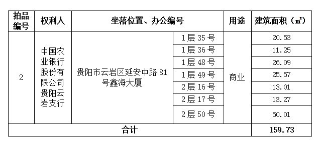 標的位于貴陽市云巖區延安中路81號鑫海大廈1層35、36、48、49號,2層16、17、50號,該標的總建筑面積為:159.73㎡,分攤土地使用權面積分別為0.76㎡、0.42㎡、0.96㎡、0.95㎡、0.48㎡、0.49㎡、1.85㎡;地類用途:商務金融用地,土地使用權類型為出讓,土地使用權終止日期為2047年12月31日,土地所有權為國家所有;樓層:總層數27層,標的位于樓宇總層數27層的第1、2層,層高:住宅商業層高3.5m,住宅層高2.8m;建筑結構:框架結構。