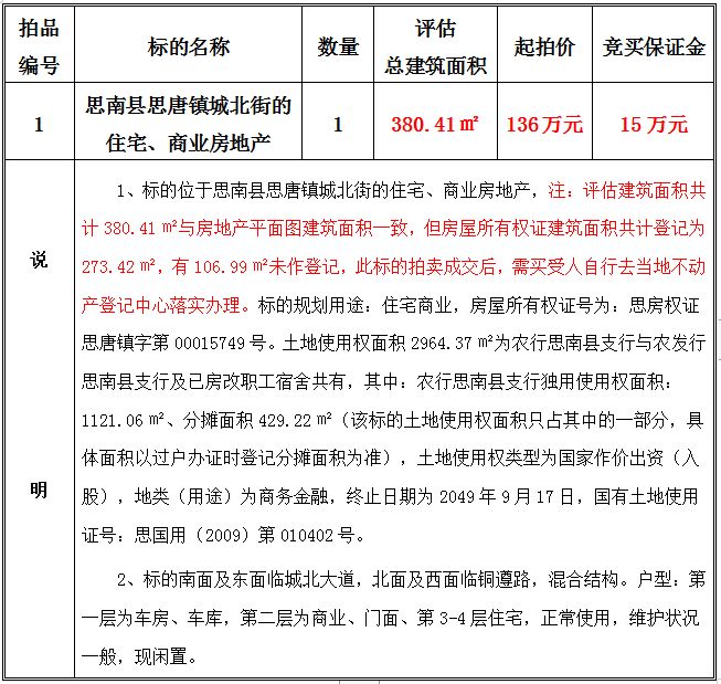 1、思南縣思唐鎮城北街的住宅、商業房地產,建筑面積共:380.41㎡;起拍價:136萬元;競買保證金15萬元。