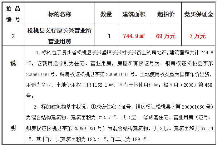 2、松桃縣支行原長興營業所營業用房,建筑面積共:744.9㎡;起拍價:69萬元;競買保證金:7萬元。