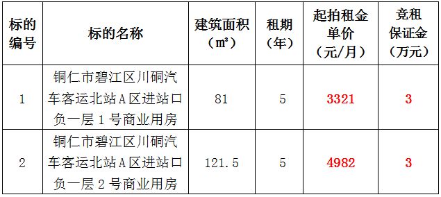 1、銅仁市碧江區(qū)川硐汽車客運北站A區(qū)進站口負一層1號門面,面積:81㎡,租賃期:5年,起拍租金:3321元/月,競租保證金:3萬元;