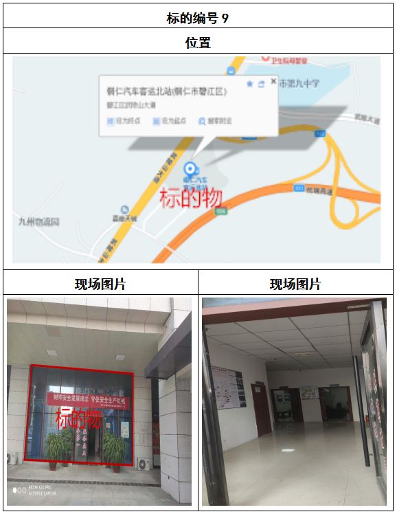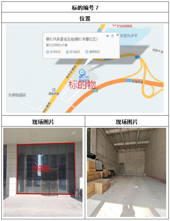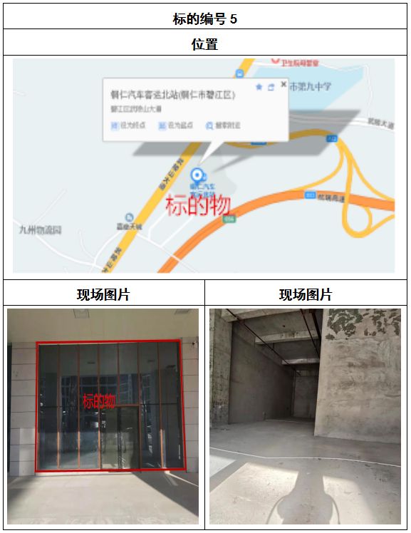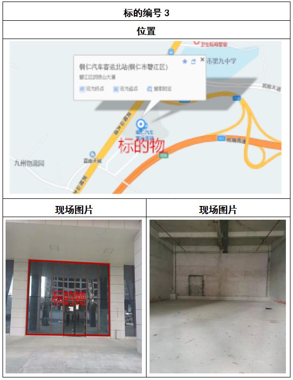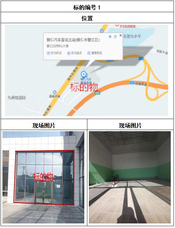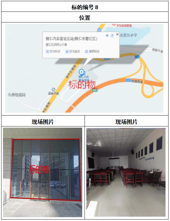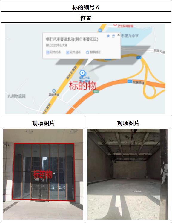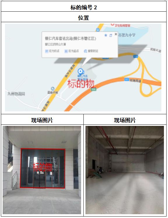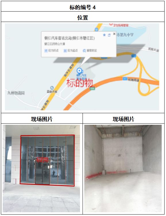 拍品8號和9號標的位于銅仁碧江區(qū)川硐汽車客運北站A區(qū)進站口負一層8-9號的商業(yè)房地產(chǎn),位于銅仁市中心以北,銅仁汽車北站安置旁,建筑面積分別為:121.5㎡、121.5㎡,租賃期5年,該標的位置交通便利,人流量大。