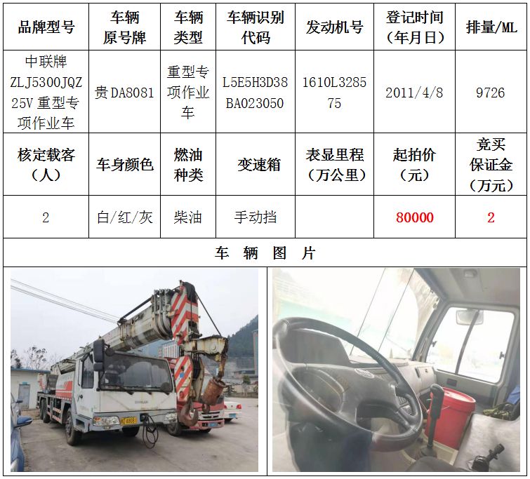 1、中聯牌重型專項作業車一輛,起拍價:80000元,競買保證金:2萬元;