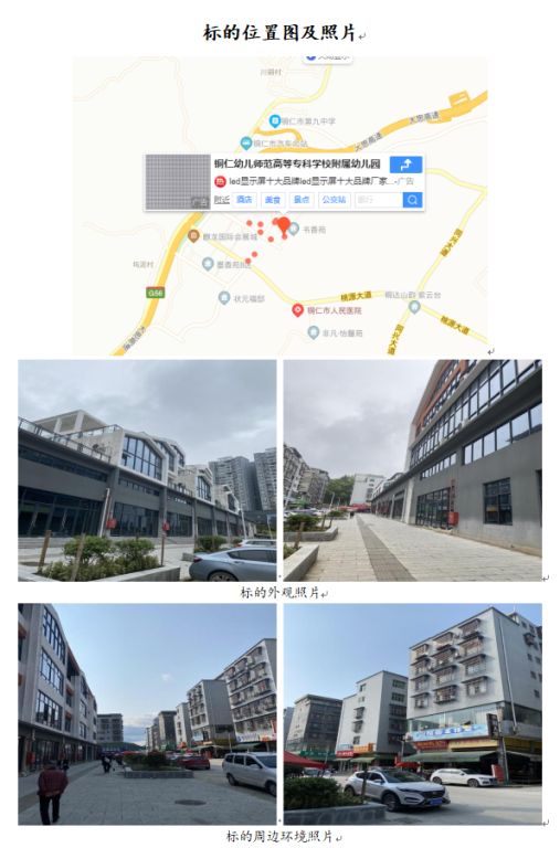 標的位于銅仁幼兒師范高等專科學校附屬幼兒園,所在樓棟均為商業樓,房屋總層數為3層,標的位于該樓棟的第1層,為步梯房,總建筑面積為1165.8平方米,框架結構,層高約3.5米-4.5米,用途為商業用房,目前均處于空置狀態,建成于2019年。