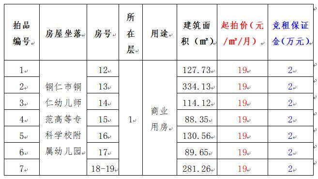 【已結束】銅仁幼兒師范高等專科學校附屬幼兒園12至19號商業用房房地產租賃權拍賣公告