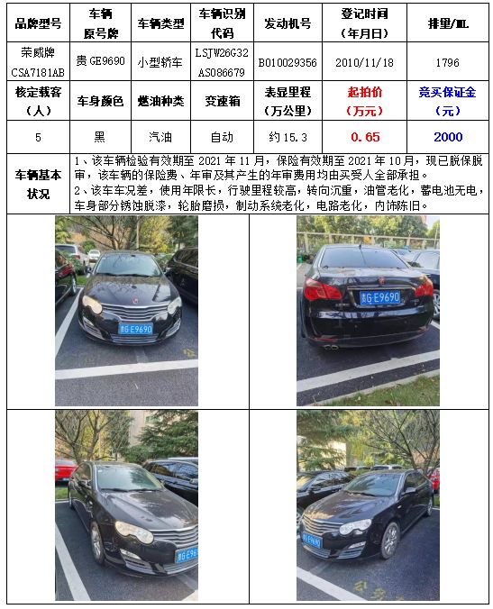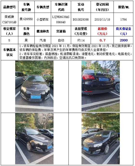 拍品編號1:榮威牌CSA7181AB小型轎車一輛