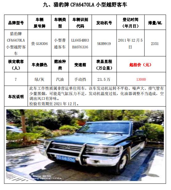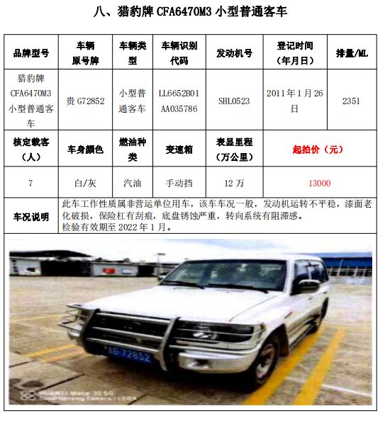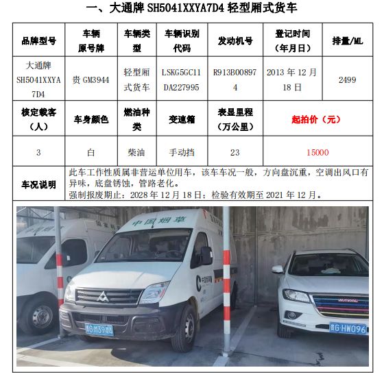 受委托,我公司于2021年12月14日(星期二)下午14:30在貴州省貴陽市中華南路20號(hào)新大陸數(shù)碼廣場10樓D座會(huì)議室公開拍賣以下標(biāo)的:大通牌SH5041XXYA7D4輕型廂式貨車2輛、大通牌SH5041XXYA6D4輕型廂式貨車1輛、江鈴全順牌JX5047XXYDLA2-H輕型廂式貨車2輛、江鈴全順牌JX5047XFWMD小型專項(xiàng)作業(yè)車1輛、五十鈴牌QL1020UGDSC輕型普通貨車1輛、獵豹牌CFA6470M3小型普通客車1輛、獵豹牌CFA6470LA小型越野客車1輛,共計(jì)9輛車整體拍賣。