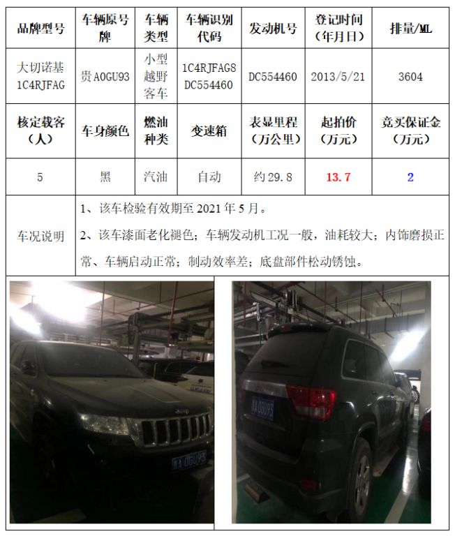 拍品編號1:大切諾基1C4RJFAG小型越野客車(原號牌貴A0GU93)一輛