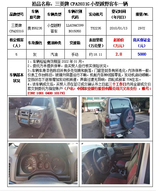 【已結束】中國農業銀行股份有限公司黔西南分行機動車拍賣公告