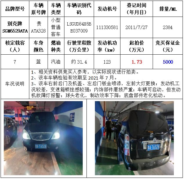 拍品編號3:別克牌SGM6529ATA小型普通客車一輛
