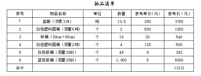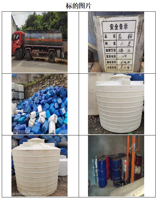 該批標的為整體拍賣,鹽酸是氯化氫(HCl)的水溶液[2],屬于一元無機強酸,工業用途廣泛。鹽酸的性狀為無色透明的液體,有強烈的刺鼻氣味,具有較高的腐蝕性。可用于分析化學、酸洗鋼材、制有機化合物、制無機化合物、控制pH等。
