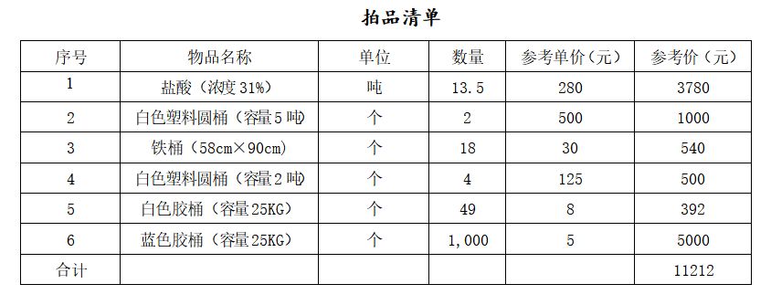 該批標的為整體拍賣,鹽酸是氯化氫(HCl)的水溶液[2],屬于一元無機強酸,工業(yè)用途廣泛。鹽酸的性狀為無色透明的液體,有強烈的刺鼻氣味,具有較高的腐蝕性。可用于分析化學(xué)、酸洗鋼材、制有機化合物、制無機化合物、控制pH等。