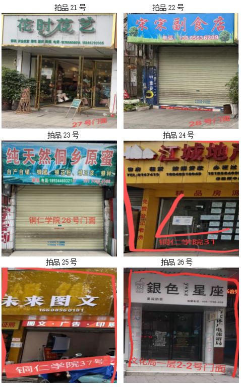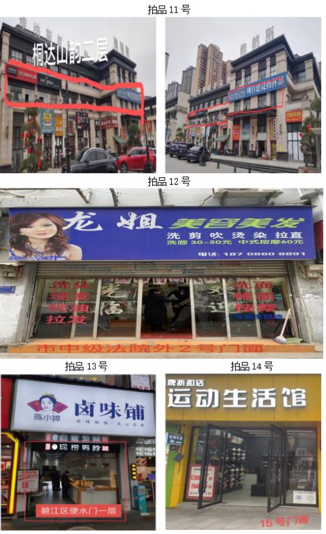 拍品14至22號標的:位于清水大道銅仁農校旁,地理位置優越,屬于黃金大道。附近有大專、中學、小學、幼兒園等,教學配套齊全;擁有眾多小區,人口流動能力強,固定人口較多;周圍有超市、商場,人口流動性強。地理位置優越,屬于臨街門店,升值空間較大;地區基礎設施完善,公共交通、公共停車設施的增加,使該地升值空間進一步增大;建筑結構:磚混,面積:27.6㎡至42.4㎡不等(具體面積見上表),租賃期3年(具體日期見上表),保養情況:較好。