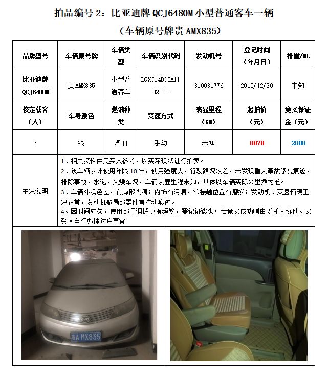 拍品編號2:原車牌號貴AMX835比亞迪牌QCJ6480M小型普通客車一輛;