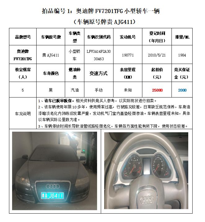 拍品編號1:原車牌號貴AJG411奧迪牌FV7201TFG小型轎車一輛;