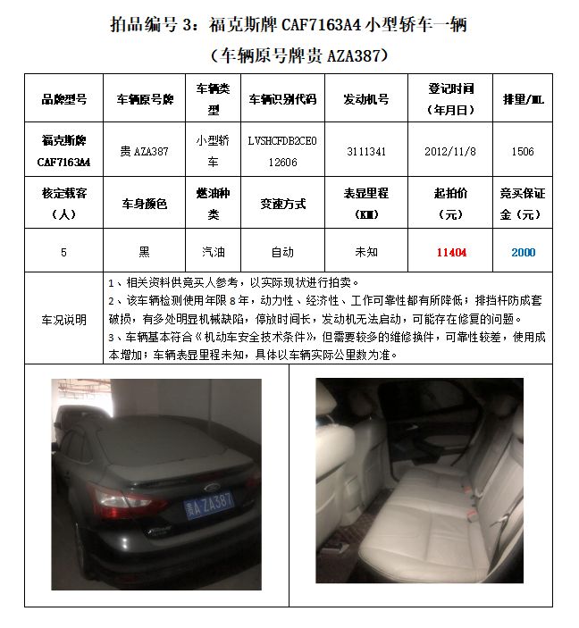 拍品編號3:原車牌號貴AZA387福克斯牌CAF7163A4小型轎車一輛;