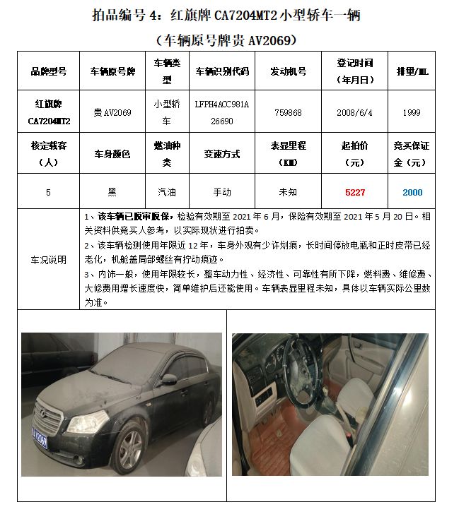 拍品編號4:原車牌號貴AV2069紅旗牌CA7204MT2小型轎車一輛;