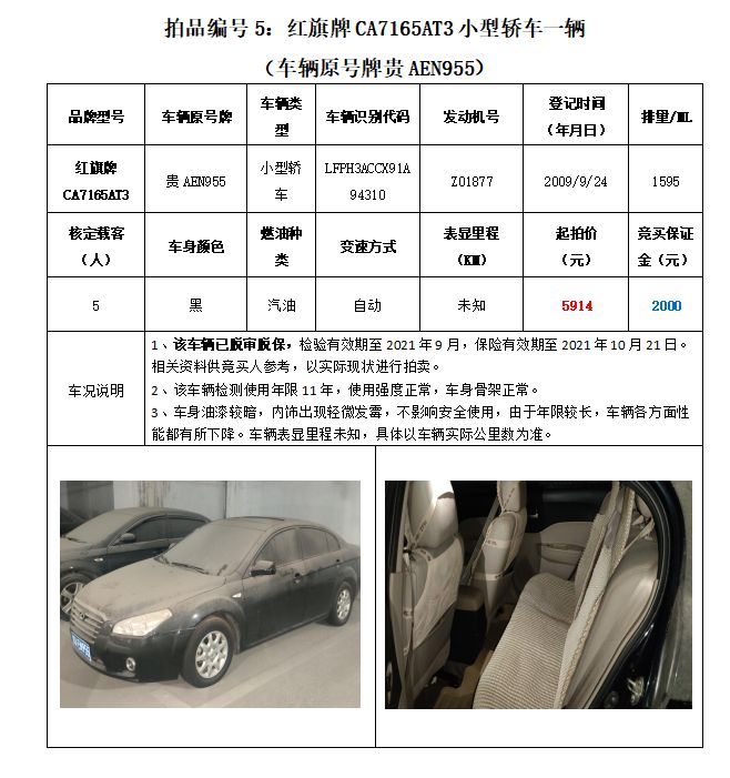 拍品編號5:原車牌號貴AEN955紅旗牌CA7165AT3小型轎車一輛;