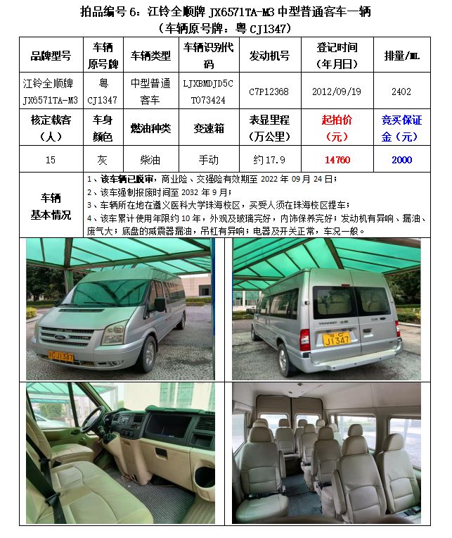 拍品編號6:原車牌號粵CJ1347江鈴全順牌JX6571TA-M3中型普通客車一輛;