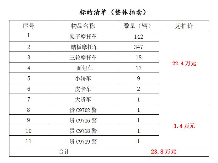 該批標的為整體拍賣,包括架子摩托車、踏板摩托車、三輪摩托車、面包車、小轎車、皮卡車、大貨車一批(均作為報廢物資整體拍賣)。