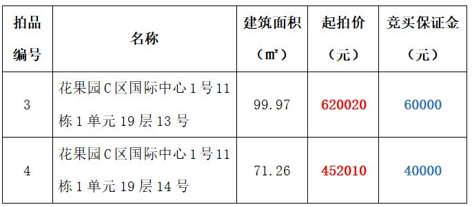 標的位于貴陽市南明區花果園彭家灣花果園C區(貴陽國際中心1號)11棟1單元19層13號、14號花果園商鋪(商業寫字樓),房屋為一般裝修,包含水電敷設及安裝、地面地磚、墻面刷瓷粉及乳膠漆、頂面鋁扣板吊頂、玻璃門。其中標的3號建筑面積為99.97㎡、套內面積為73.48㎡;標的4號建筑面積為71.26㎡、套內面積為52.38㎡。