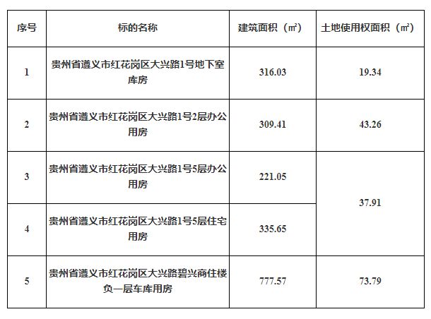 2、貴州省遵義市紅花崗區大興路1號地下室庫房(總建筑面積:316.03㎡);貴州省遵義市紅花崗區大興路1號2層辦公用房(總建筑面積:309.41㎡);貴州省遵義市紅花崗區大興路1號5層辦公用房(總建筑面積:221.05㎡);貴州省遵義市紅花崗區大興路1號5層住宅用房(總建筑面積:335.65㎡);貴州省遵義市紅花崗區大興路碧興商住樓負一層車庫用房(總建筑面積:777.57㎡)。