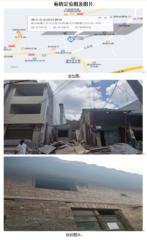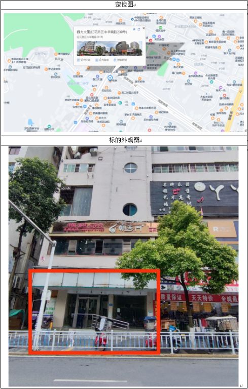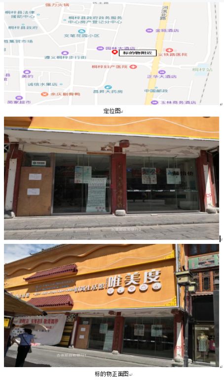 標的坐落于貴州省遵義市桐梓縣婁山關鎮古夜郎街喜洋洋超市南側,房屋建筑面積:106.65㎡,為臨夜郎街的獨立商業用房,臨街寬度約7.9m,進深約13.5m;房屋總層數為5層,標的所在層數為1層,層高約3.3m;權利性質:國有建設用地使用權/房屋(構筑物)所有權;權利性質:國有土地/作價出資(入股)/自建房;用途:商務金融用地/商業、金融、信息;房屋結構:混合結構,目前為閑置狀態。
