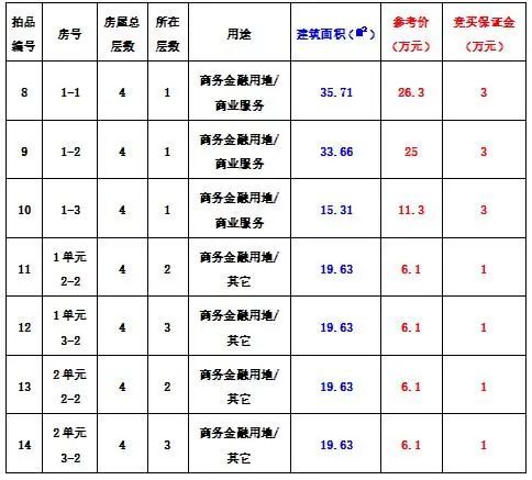 2、1號地下室庫房總層數為13層,標的所在層數為-1層,證載房屋建筑面積為316.03㎡,標的規劃用途為庫房。2號辦公用房總層數為13層,標的所在層數為2層,證載房屋建筑面積為309.41.㎡,標的規劃用途為辦公用房。3號辦公用房總層數為10層,標的所在層數為5層,證載房屋建筑面積為221.05㎡,標的規劃用途為辦公用房。4號住宅總層數為13層,標的所在層數為5層,證載房屋建筑面積為335.65.㎡,標的規劃用途為住宅。5號車庫總層數為9層,標的所在層數為-1層,證載房屋建筑面積為777.57㎡,標的規劃用途為車庫。