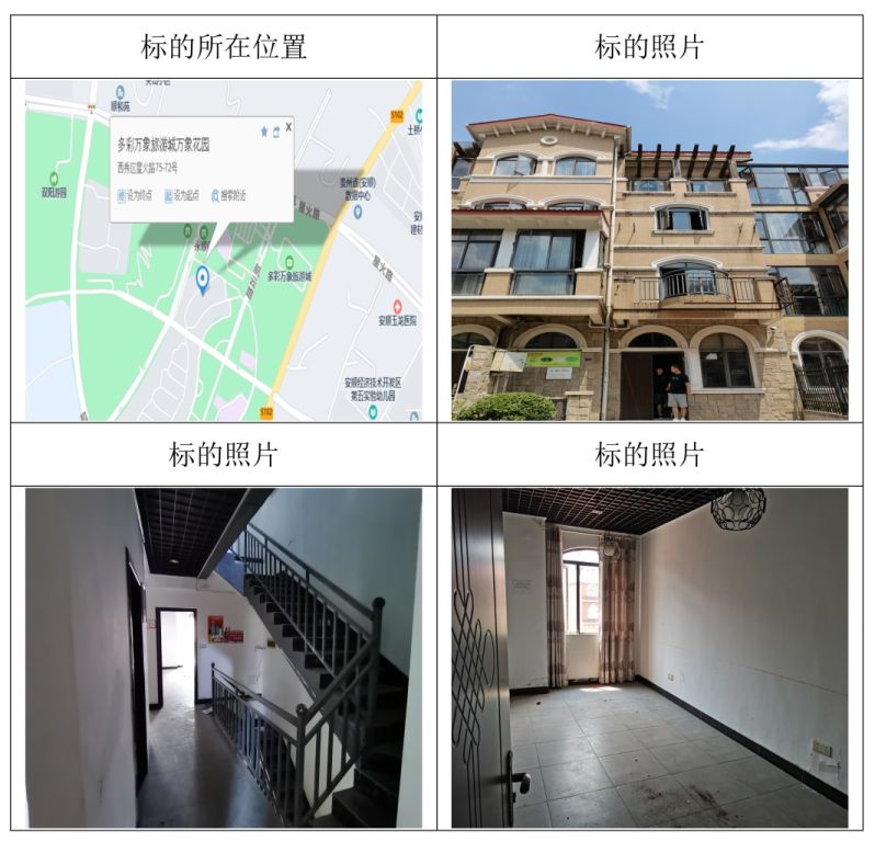 標(biāo)的位于安順市開發(fā)區(qū)幺鋪鎮(zhèn)大屯村多彩萬象旅游城,標(biāo)的房屋總樓層數(shù)為4樓,所在樓層為一躍四,一樓戶型為一廚一衛(wèi)一個(gè)大廳,二樓戶型為四個(gè)房間,兩個(gè)衛(wèi)生間,三樓為四個(gè)房間兩個(gè)衛(wèi)生間,四樓為兩個(gè)房間一衛(wèi)一個(gè)平臺。標(biāo)的有部分滲水情況,為毛坯房。