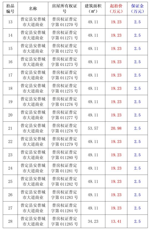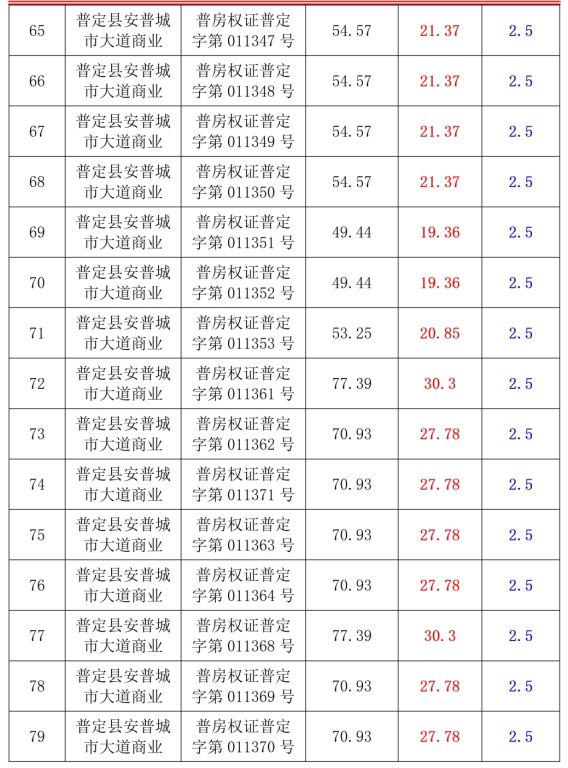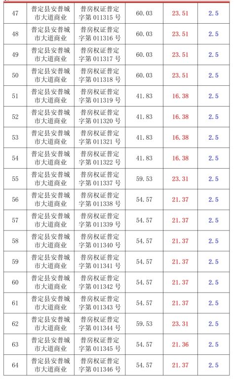 13、拍品編號13-79:普定縣安普城市大道商業(yè)展位67個(gè);建筑面積:約34.23㎡-77.39㎡。