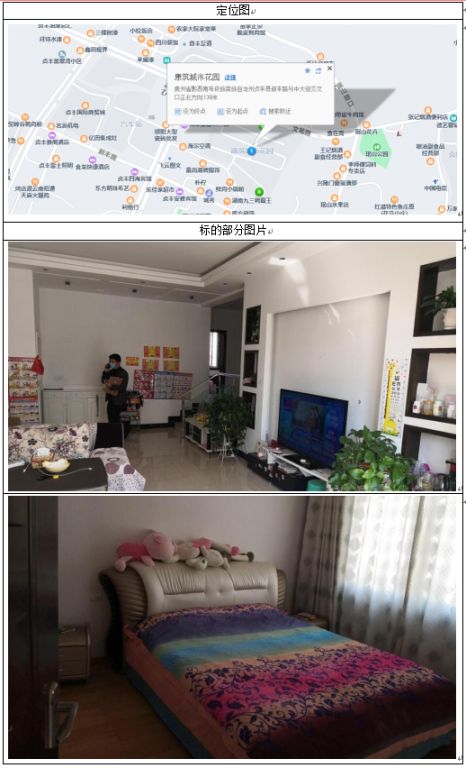 1、標的位于貞豐縣珉谷街道辦中大街康筑城市花園,房屋總層數為6層,標的所在層數為1層。產權證號:貞房權證珉谷鎮字第20090403號,房屋證載建筑面積138.1㎡(實測面積133.91㎡),房屋結構為混合結構,設計用途為商鋪,土地使用權截止2055年6月23日。