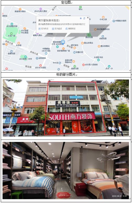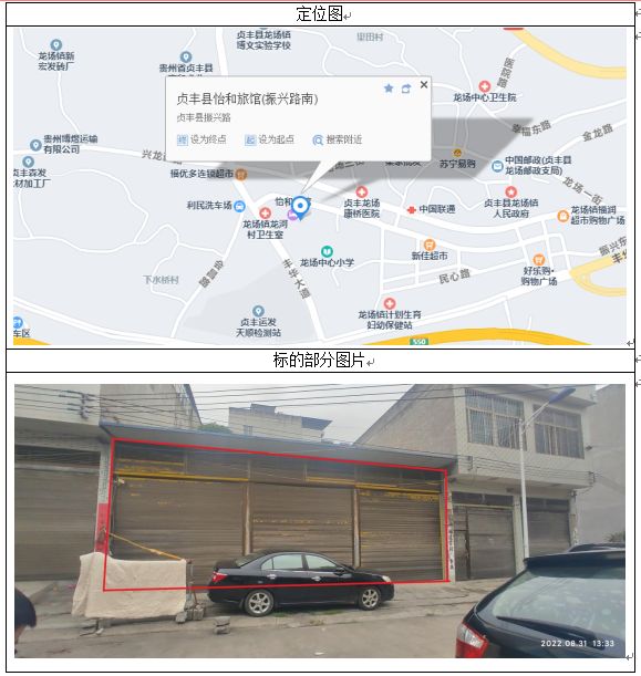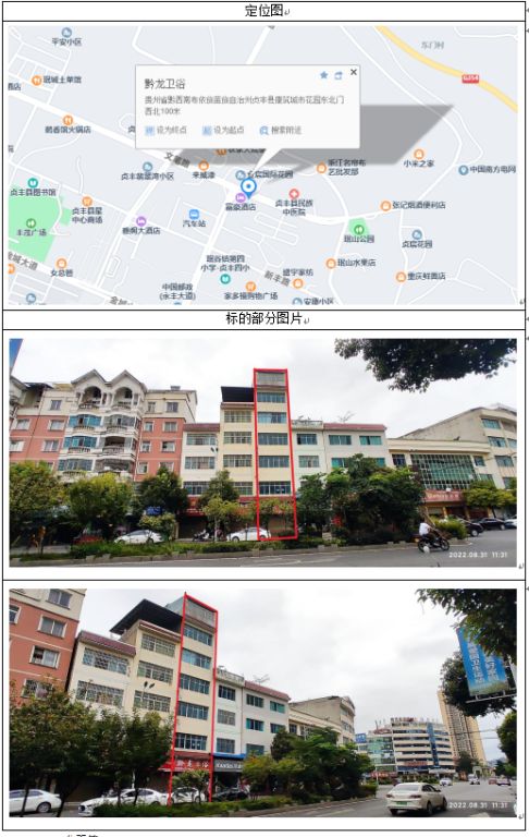 標的位于貞豐縣龍場鎮興龍商貿區,房屋總層數為6層。產權證號:貞房權證龍場鎮字第20120349號、貞國用2012第004022號,房屋證載建筑面積2278.03㎡(實測面積2263.59㎡),其中商用建筑面積:1818.71㎡,住宅建筑面積:459.32㎡;規劃用途為商住,混合結構。證載土地面積1152㎡(實測面積1183.74㎡),地類用途為商住,使用權類型為出讓,土地使用權終止日期為2058年9月6日。