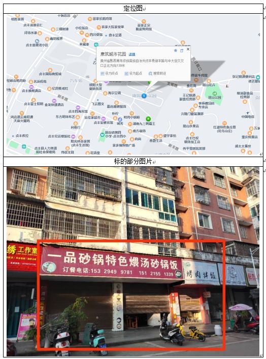 標的位于貞豐縣珉谷鎮塔山大道,房屋總層數為7層。產權證號:貞房權證珉谷鎮字第20110001號、貞國用(2010)第001464號,房屋證載建筑面積920.97㎡(實測面積938.31㎡),證載土地面積140.625㎡(實測面積136.66㎡),規劃用途為商住,使用權類型為出讓,土地使用權年限:42年。