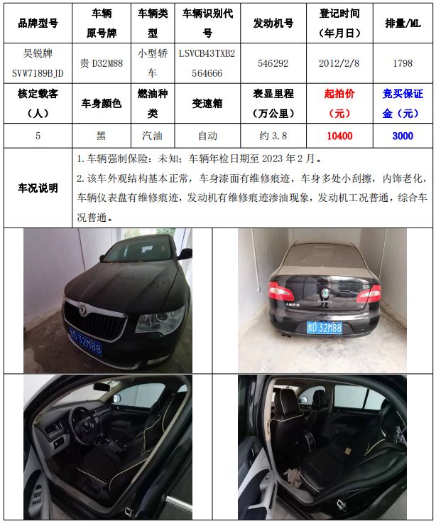 拍品編號3:昊銳牌SVW7189BJD小型轎車一輛