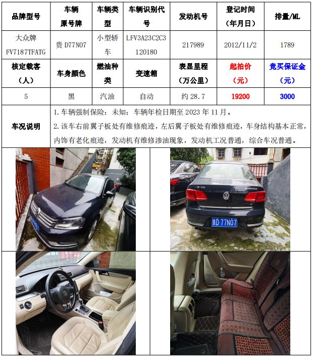 拍品編號1:帕薩特牌SVW7203EPD小型轎車一輛