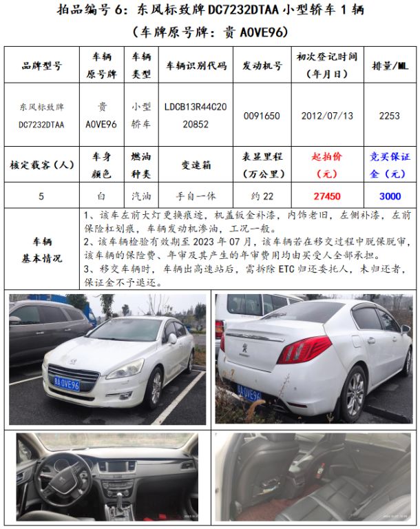 拍品編號6:東風標致牌DC7232DTAA小型轎車1輛(車牌原號牌:貴A0VE96);