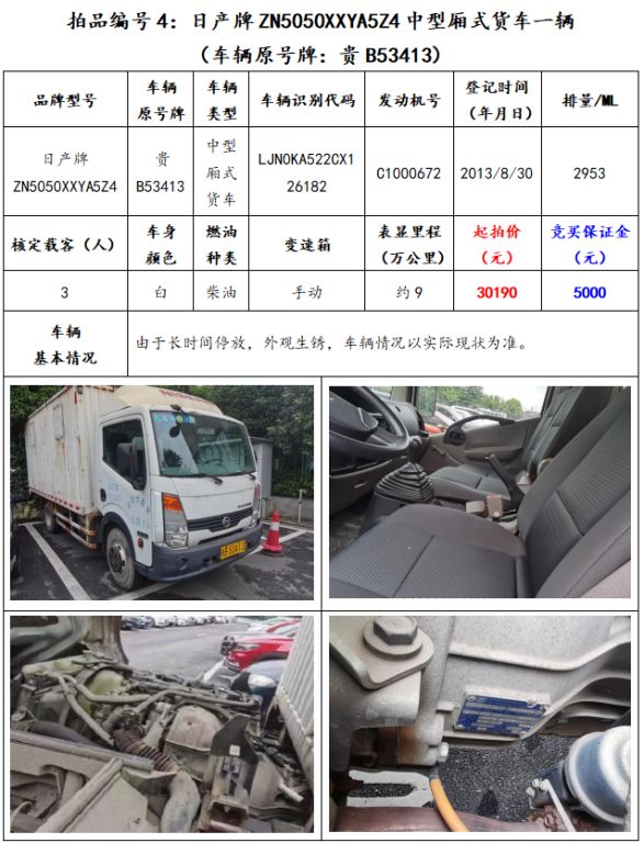 拍品編號4:日產牌ZN5050XXYA5Z4中型廂式貨車一輛(車輛原號牌:貴B53413);