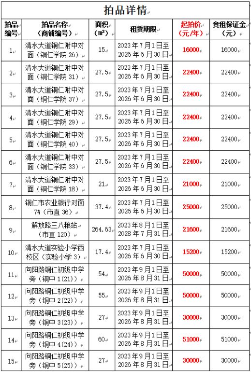 15、向陽路銅仁初級中學(xué)旁(銅中5(25)),面積:27㎡,租賃期:2023年9月1日至2026年8月31日,起拍價:30000元/年,競租保證金:30000元。