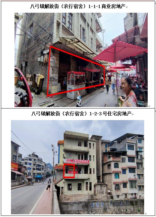 標的位于三穗縣文筆街道解放路、八弓鎮解放街(農行宿舍)1-1-1商業房地產、八弓鎮解放街(農行宿舍)1-4-2號、1-2-3號、1-4-1號住宅房地產,磚混結構,約1991年建成,水、電、通訊等設備設施齊全,使用正常,維護狀況一般,1、2層高約4m,3-5層高約3m。