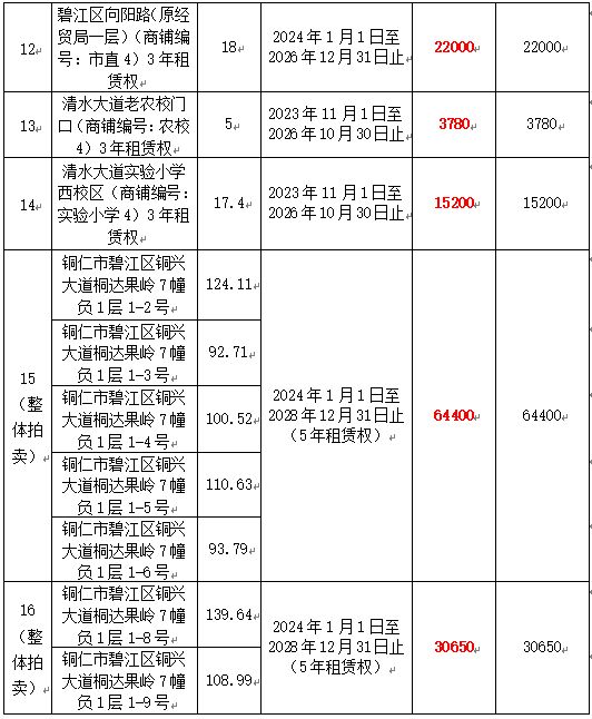 16、銅仁市碧江區(qū)銅興大道桐達(dá)果嶺7幢負(fù)1層1-8號(hào)、銅仁市碧江區(qū)銅興大道桐達(dá)果嶺7幢負(fù)1層1-9號(hào)5年租賃權(quán)(整體拍賣(mài)),面積分別為:139.64㎡、108.99㎡,租賃期:2024年1月1日至2028年12月31日止,起拍價(jià):30650元/年,競(jìng)租保證金:30650元,自2027年1月1日起租金按3%逐年遞增。