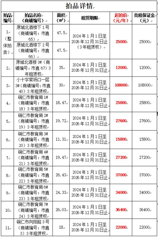 11、銅仁市向陽(yáng)路3號(hào)(商鋪編號(hào):市直3)3年租賃權(quán),面積:18㎡,租賃期:2024年1月1日至2026年12月31日止,起拍價(jià):22000元/年,競(jìng)租保證金:22000元;