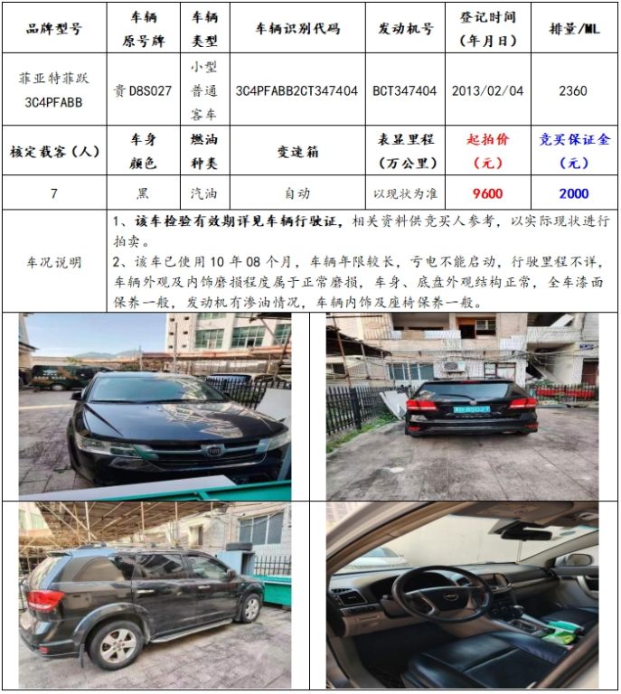 拍品編號1:菲亞特菲躍3C4PFABB小型普通客車一輛(車輛原號牌:貴GC0249);