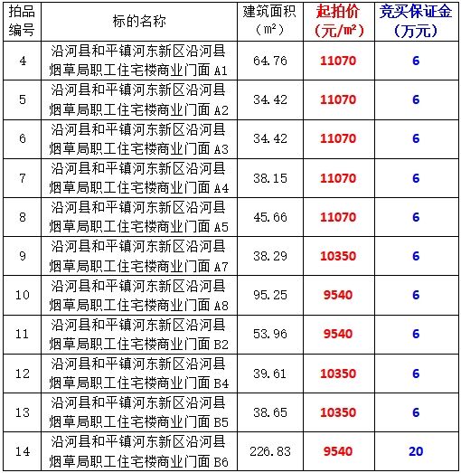 4、沿河縣和平鎮(zhèn)河?xùn)|新區(qū)沿河縣煙草局職工住宅樓商業(yè)門面11間,建筑面積:34.42㎡-226.83㎡,起拍價:9540元/㎡-11070元/㎡,競買保證金:6萬元/間。