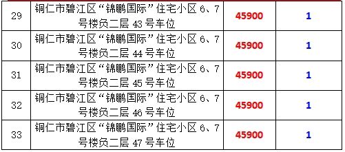 拍品編號15-33:銅仁市碧江區(qū)“錦鵬國際”住宅小區(qū)6、7號樓負(fù)一層:32號、35號、53號,負(fù)二層:32號-47號共計19個車位